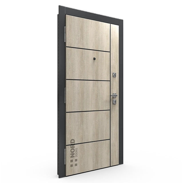 Два замкнутых цельногнутых профиля дверной коробки скреплены между собой через пробковый утеплитель, не имеют прямого контакта по всей плоскости соединения, тем самым обеспечивают реальный терморазрыв (отсутствие промерзания коробки, образования наледи и конденсата, а также избыточных затрат на отопление).